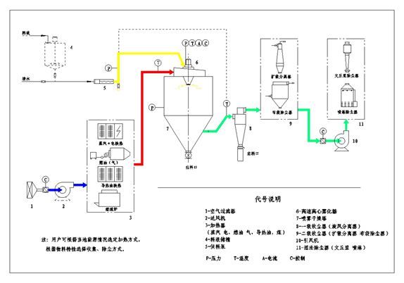 空气通过过滤器和加热装置后,进入干燥塔顶部的热风分配装置,通过此装置使洁净的、热的空气均匀的进入干燥塔,并呈螺旋状转动,同时将料液送到安置在干燥塔顶中间的离心雾化器中,料液被离心雾化器雾化成雾滴,使料液和热空气的接触面积增加,水分迅速蒸发,在短时间内干燥。再通过之后的除尘设备等,将干燥好的成品取出。成品连续的由收料口输出,废气由引风机排空。